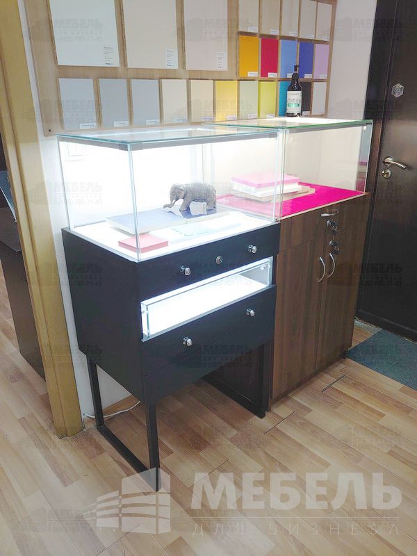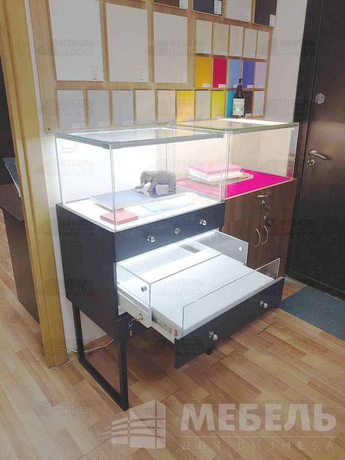 Прилавок для ювелирного магазина с тремя уровнями выкладки товара, нижние уровни выполненны с откатным стеклянным куполом назад прилавка для демонстрации товара покупателю, каркас выполнен из МДФ и пластика 1000х600х1500мм, накопитель с распашными дверьми. Возможен любой вариант цвета и дизайна по желанию заказчика. Додная подсветка устанавливается как дополнительная опция.