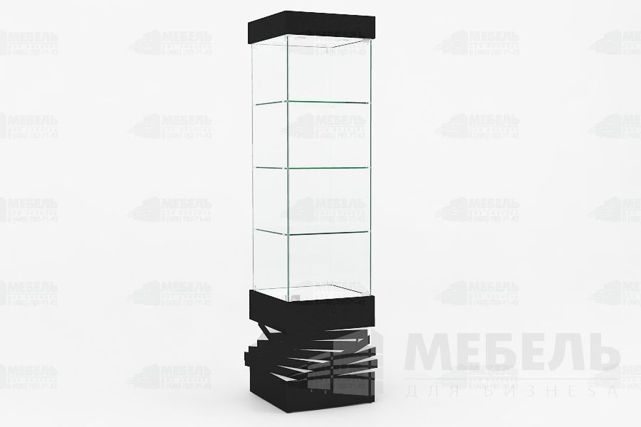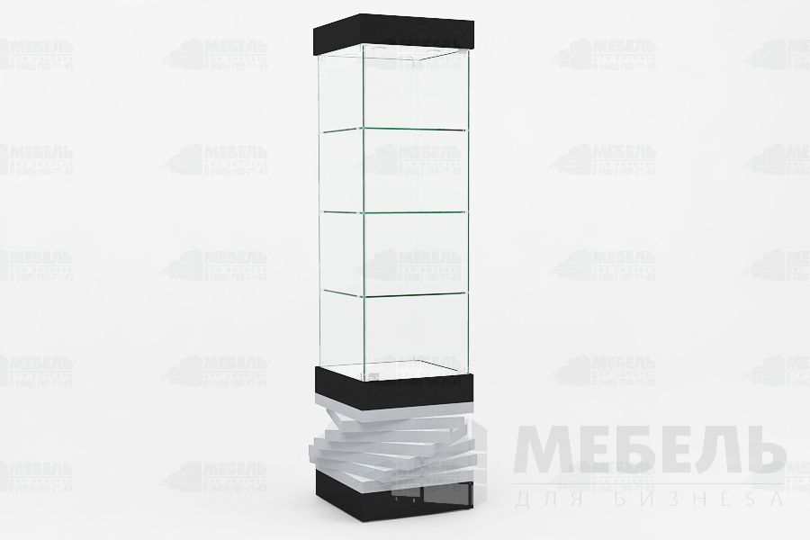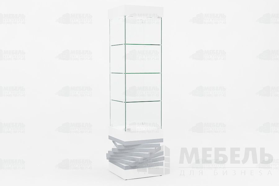 Витрина стеклянная для экспозиции кубков и наград из стекла 6мм со стеклянными полками, стеклянная дверь на замке, каркас из панелей ЛДСП 50мм. Габариты витрины 530х530х2000мм Высота стеклянной части 1300мм. При необходимости возможна установка диодных светильников в верхнем фризе. Цвет каркаса витрины можно изменить.