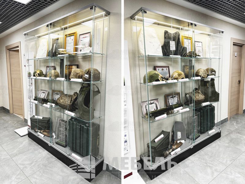 Витрина для музея из стекла 6мм с прутковой (6мм) системой передвижения полок, полки стекло 8мм, основание ЛДСП 16-32мм высотой 200мм (цвет можно выбрать).