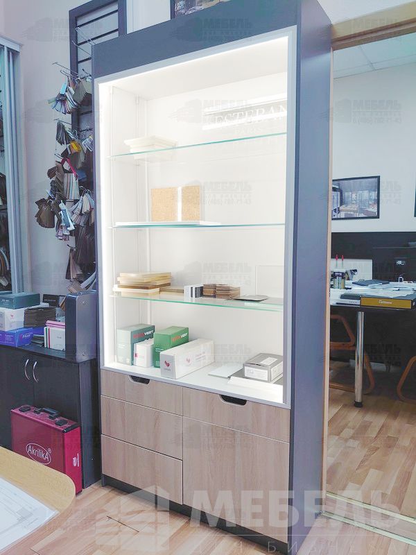 Задник витрины выполнен из ЛДСП двух цветов (наложение фона).