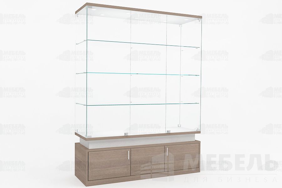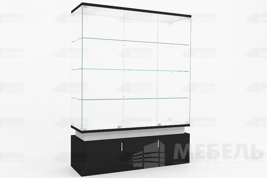 Стеклянная витрина для музея из ЛДСП и стекла 1500х500х2000мм. высота стеклянной части 1450мм с двумя распашными стеклянными дверьми на замке с центральным глухим стеклом, стеклянные полки 3шт. (возможно дополнительно установить прутковую систему передвижения полок), задняя стенка стекло 6мм, основание тумба (высота 500мм) с распашными дверьми на замке.
